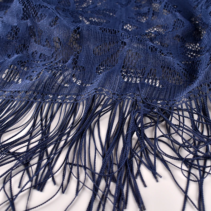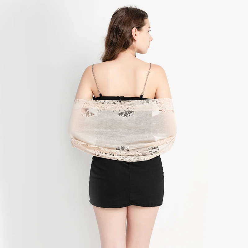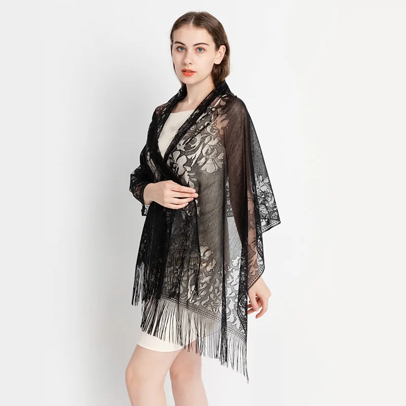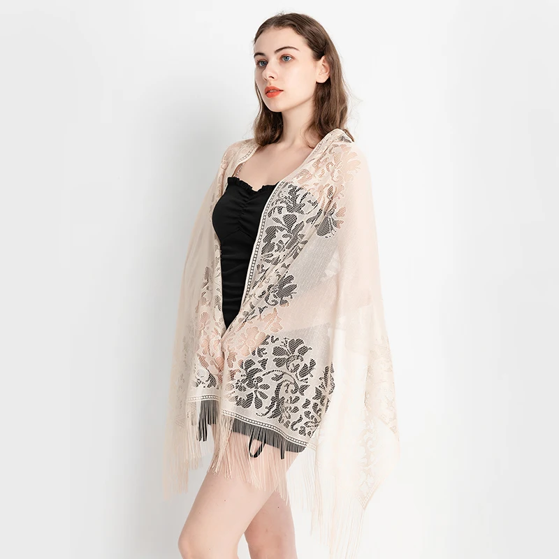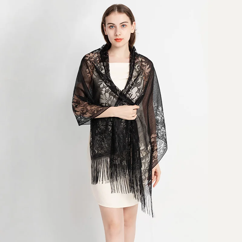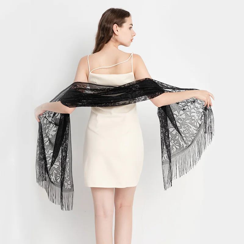 Fashionable and versatile simulation silk lace shawl, the fabric has the advantages of softness, elegance, smoothness, breathability, and easy washing. In addition, it has stronger comfort and better drapability.
