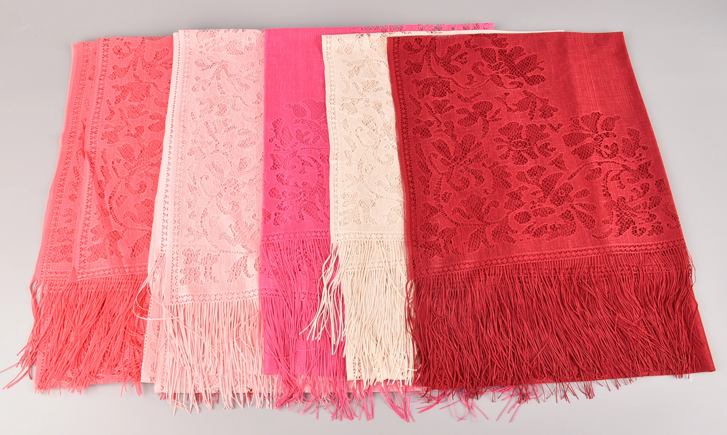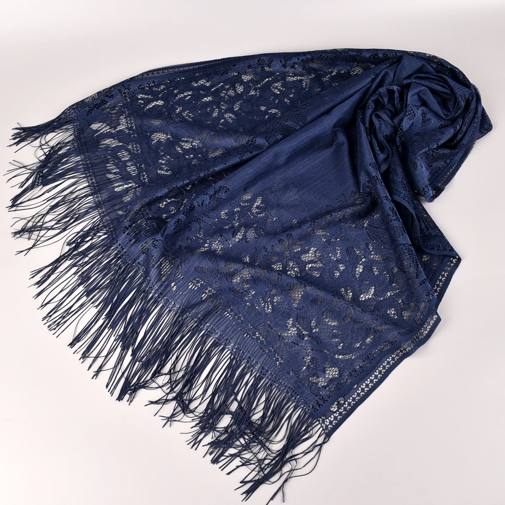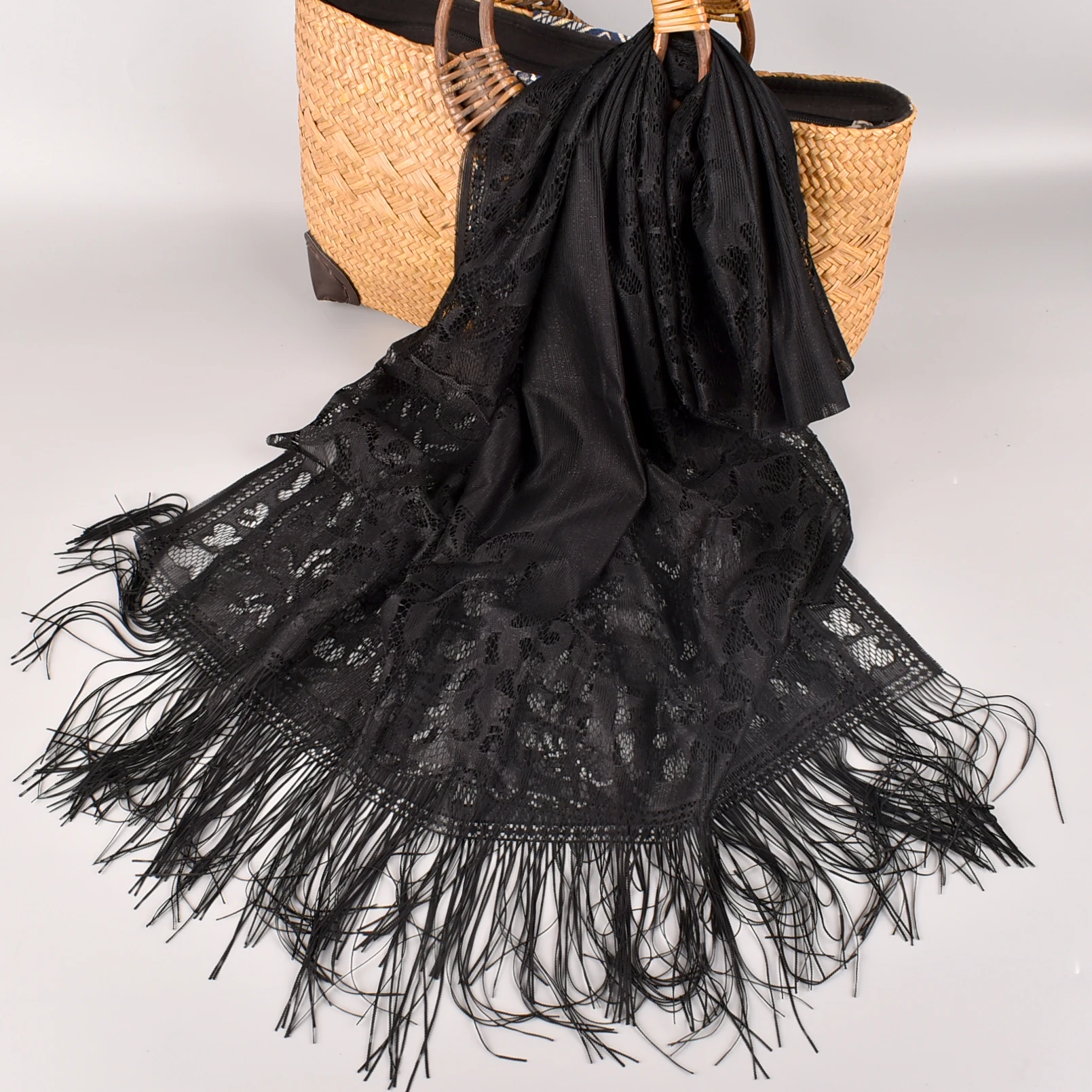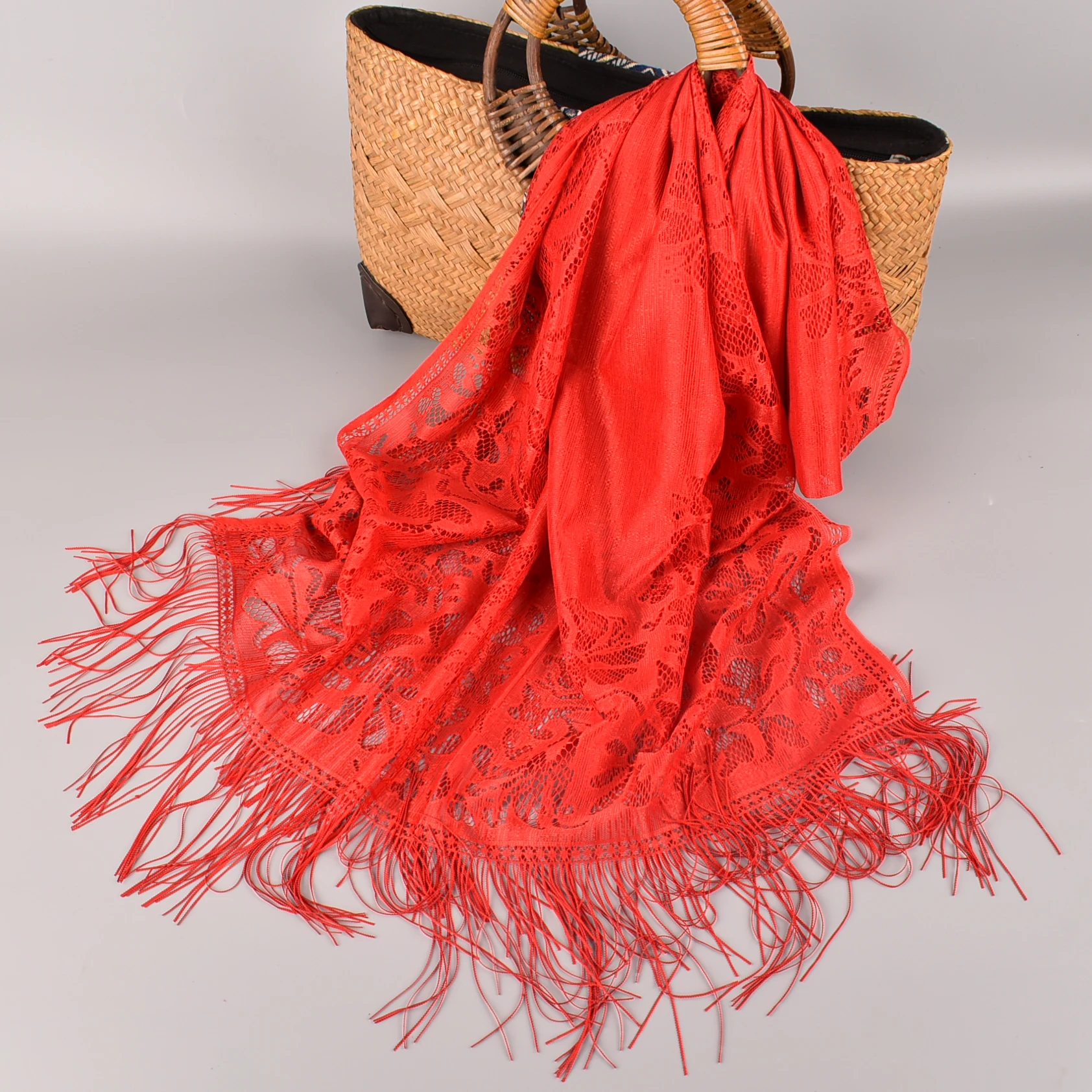 Fashionable and versatile simulation silk lace shawl, the fabric has the advantages of softness, elegance, smoothness, breathability, and easy washing. In addition, it has stronger comfort and better drapability.